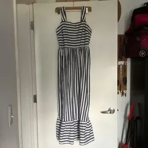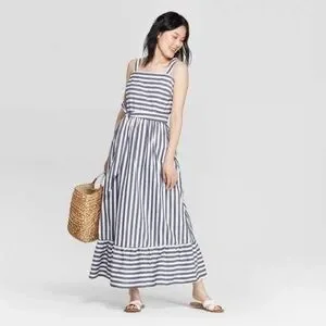 A new day brand. Purchased at target. Never worn. Size small. Blue white stripe. Square neck. Adjustable straps. Empire waist. Flowing maxi skirt with tiered truffle hem. Vertical stripes and horizontal stripes. Come with tie belt. Embrace effortless style with this chic striped maxi dress. Featuring a classic blue and white pattern, it's perfect for any occasion. Enjoy comfort and elegance in one beautiful piece. Like new. Never worn. Stock image used to show style and fit. Perfect for summer. Boho bohemian vibes. Preppy seersucker vibes.