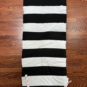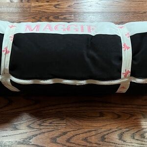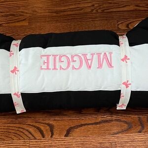 Bow sleeping bag personalized "Maggie" sewn into bottom section of the bag. Cute pink bow with repeated bow pattern on interior lining. White stripe, 100% cotton. Size 62 x 26. Like new condition as only used for a few sleepovers at Grandma's house. Up close photos of minor stain on backside of bag. Rolls up nicely with velcro straps decorated with pink bow.