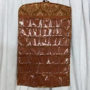 Elegant hanging jewelry organizer with clear pockets. Features a beautiful brown and gold design.