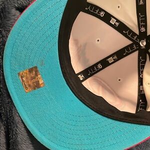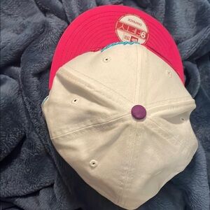 Stylish Chicago Bulls snapback hat. Features bold red and blue logo on a white cap with a pink brim.
