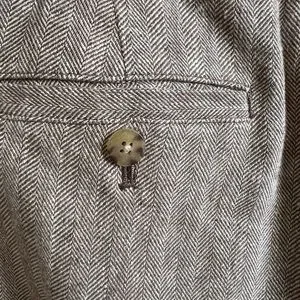 Designed in a light weight cotton / linen blend. Straight leg button front trousers in a subtle herringbone pattern feels clastic next to other details like tacked cuffs, angled front front pockets and back welt pockets with buttons. Easy cropped length and timeless shape look fabulous with all your tops and jackets.