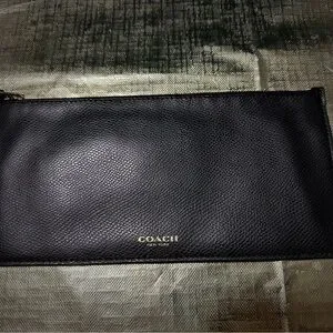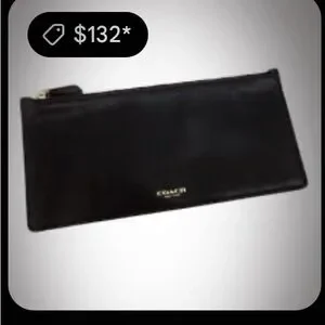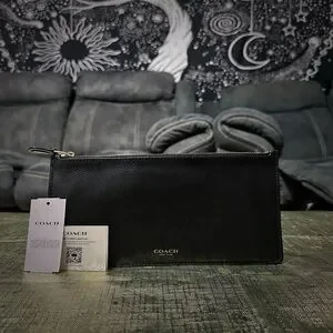 This Coach black leather wallet features a sleek and minimalist design, crafted from high-quality leather with a subtle sheen. Its versatile style makes it perfect for both formal and casual occasions, offering a touch of elegance to any ensemble.