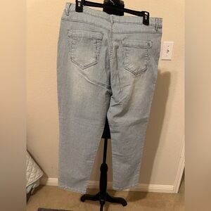 Experience the perfect blend of style and comfort with these Gloria Vanderbilt blue ankle cropped striped jeans. The light wash denim offers a relaxed fit, making them ideal for casual outings. Their slightly distressed look adds a touch of modern flair to your wardrobe.