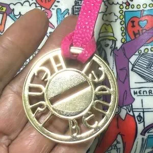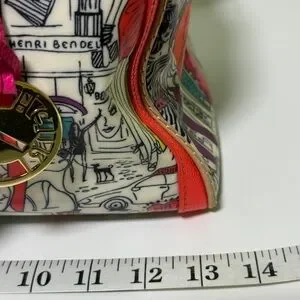 This Henri Bendel satchel showcases a striking graphic design with bold pink and orange accents, offering a chic and urban flair. The structured silhouette and vibrant colors make it a standout accessory for any fashion-forward ensemble.
