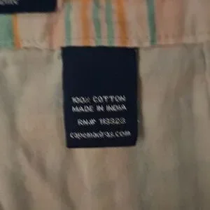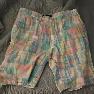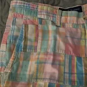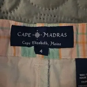 Cape Madras is a brand that specializes in madras' clothing. These shorts are characterized by their colorful patchwork design, featuring a variety of plaid patterns. The shorts have a relaxed fit and are made of 100% cotton