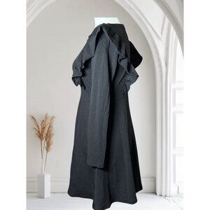 This black A-line dress is a sophisticated choice featuring elegant ruffle detailing and a fitted silhouette. Made from soft fabric, it ensures comfort and style for formal events or professional settings.