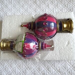 Set of two Bombay Kids Jeweled curtain finials. Purple and pink with faux gems. Never used; one is still in the original wrapping. Finial screws on to curtain rod. Colorful and fun for a kid/teen room. Note that the box is written on on one side (see photo).