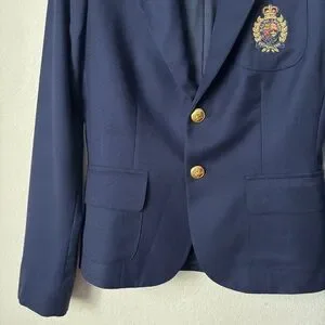 Ralph Lauren Wool Logo Crest Embellished Button Front Navy Blue Blazer