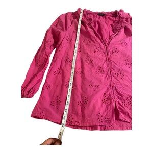 This elegant J. Crew blouse in a vibrant pink hue features a stylish ruched and ruffled design, complemented by a distinctive bib collar. Crafted for a sophisticated look, it offers a comfortable fit perfect for both casual and formal occasions.