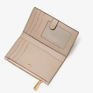 This Kate Spade wallet in a delightful pink shade features a minimalist design with a smooth saffiano texture, highlighted by elegant gold hardware. Its compact form is ideal for organizing essentials, embodying the brand's signature style and quality craftsmanship.