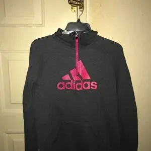 Stylish adidas sweatshirt. Features pink logo on gray fabric. Comfortable and trendy.