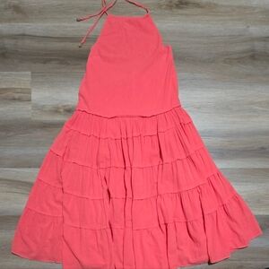 New Without Tags, Stylish coral, Pull over, top lined, Gauzy halter Style, Intricate wood beaded detail at strings, Halter maxi dress with a tiered skirt. Perfect for summer outings. Feminine and flattering, Gauzy halter Style, Intricate wood beaded detail at strings, Ties around neck and back. Boho Festival Coastal