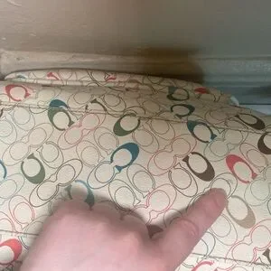 Lining is clean without rips, tears, stains or odors Some light wear on corners of the bottom of the bag. Handles are in good condition PVC Fabric with Leather Trim