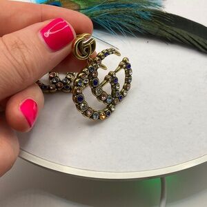 Gold GG Marmont Colorful Crystals Dangle Earrings are the epitome of show-stopping statement earrings. Adorned with colorful crystals, they're perfect for adding a touch of glamour to any outfit, whether it's day or night
