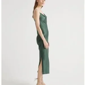 Elegant green satin midi dress. Features a sleek silhouette and side slit. Perfect for any occasion.