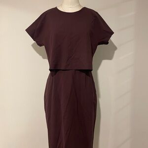 This J. Crew dress in a striking red hue features a classic sheath style with a crew neck and dolman short sleeves. Its midi length and minimalist design make it ideal for both casual and work settings.