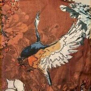 Orange and brown base with floral design in ivory, green, and blue.