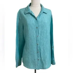 ๐ผJONES NY Green Turquoise Linen Classic Long Sleeve Button Down Shirt Medium