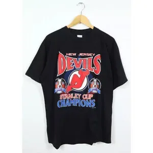The product is a New Jersey Devils 1995 NHL Hockey Stanley Cup Champions Accord Shirt in size L. It is an officially licensed shirt that commemorates the team's championship victory in the National Hockey League (NHL). Made by Accord in the United States, this unisex adult shirt features the colors and logos of the New Jersey Devils, making it a perfect piece of fan apparel for supporters of the team and hockey in general.