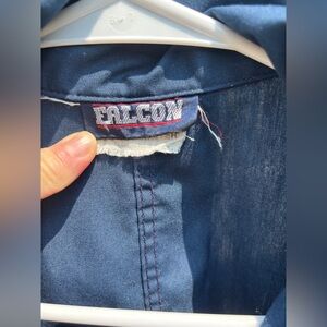 vintage blue jumpsuit. unmarked size with measurements as follows: 23” across the underarms, 16” sleeves from collar to cuff, 63” long from top of shoulder to hem, waist is about 19” unstretched to 21” stretched, 31” inseam. fabric contents: 55% polyester, 45% cotton. has an attached self-belt with a brass buckle. zipper front. back waist elastic. in excellent condition with no flaws to note. label reads “falcon” and “machine wash warm water.”
