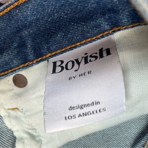 Stylish distressed Boyish women's jeans in a classic blue shade. Perfect for a casual, trendy look. Size 27. Button fly closure.