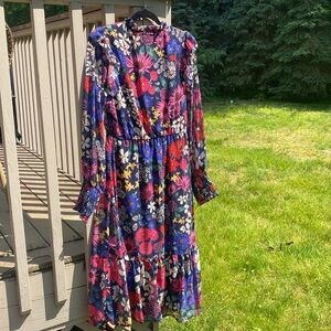 This Aqua printed dress showcases a vibrant floral pattern in pink and blue, perfect for anytime.The dress features a flattering v-neckline and elegant bishop sleeves, offering a romantic and flowing silhouette. Crafted from a light,airy fabric, it ensures comfort and style for any laid-back occasion.
