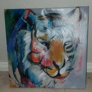 Vibrant abstract tiger canvas art featuring a blend of blue, orange, and white hues. Perfect for adding a bold statement to any room. Slight dent can be repaired