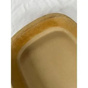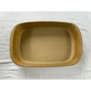 This is a used 9x13 rectangular stoneware baker by Pampered Chef. There are no chips or cracks in it.