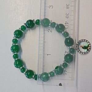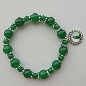 Elegant green beaded bracelet featuring silver accents and a charming Saint Judas Tadeo pendant. Perfect for adding a touch of color to any outfit.