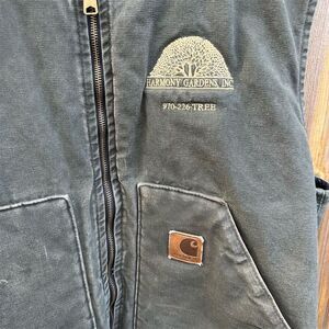 This Carhartt men's vest in size 2XL features a quilted style with a durable canvas outer shell and quilted lining, ideal for Spring, fall and winter. The vest includes dual front pockets and has an embroidered accent, fitting a vintage workwear theme. Suitable for casual and workwear occasions, it offers a regular fit and mid-length coverage. The vest is pre-owned.