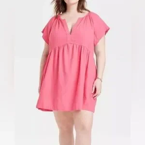 This casual sundress in a vibrant pink hue features charming flutter cap sleeves and a daring plunge neckline. Its mini length and airy fabric make it perfect for a relaxed, feminine look.
