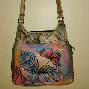 This vibrant tote bag features a stunning hand-painted design with a butterfly and peacock feathers. Perfect for adding a splash of color to any outfit.