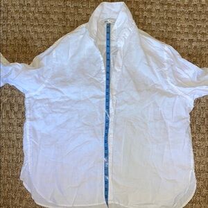 Oversized white linen button-up shirt. Perfect for any occasion. Wear it over a white tank as a jacket, a comfy top or a dressy linen shirt on a dinner date. Perfect go to shirt for a fashion emergency. Zara size med. see PICTs for measurements and tiny droplet marks on front left lapel.