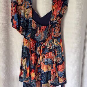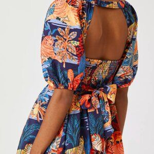 Anthropologie Puff-sleeve Mini Dress in size XL. Worn twice, in excellent condition. Ties into a cute bow in the back. Bright blues and oranges with a tiger pattern.