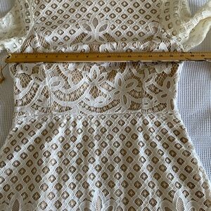 This elegant white lace dress is perfect for any dressy occasion in the summer and beyond. Good used condition. 3/4 length sleeves. Lots of stretch. Skirt hits at the knee.