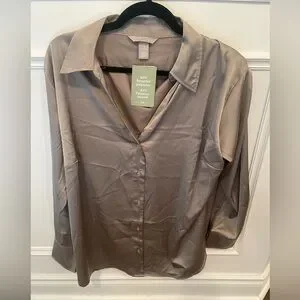 Elegant taupe button down shirt. Long sleeves. Classic collar. Perfect for any occasion.