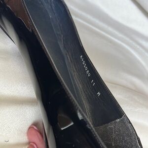 These elegant black flats by Stuart Weitzman feature a striking gold buckle design on the front, adding a touch of sophistication. Crafted from a shiny material, they offer a classic silhouette with a rounded toe, making them perfect for both casual and formal occasions. Please review photos carefully for wear areas.