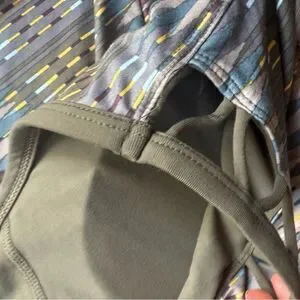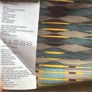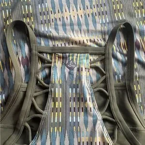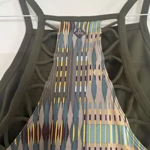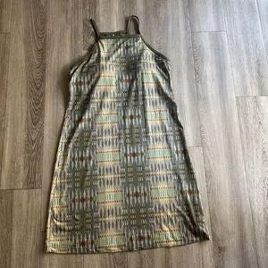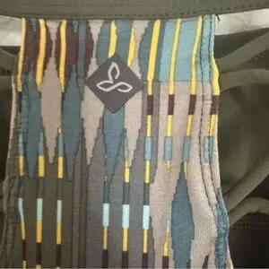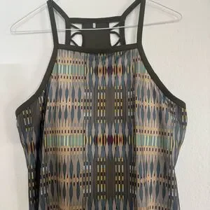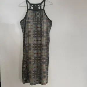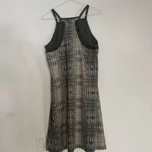 Sporty dress with moisture-wicking prAna technology. Build in bra with removable modesty cups for comfort. Perfect for tennis, golf, hiking or just enjoying a nice summer walk. Racerback knee length with unique pattern with a blend of colors it offers a comfortable fit and a chic look. Perfect like new condition.