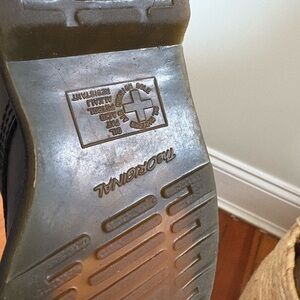 Classic black leather boots featuring a distinctive yellow tag. Iconic style and durable design.