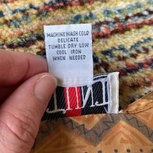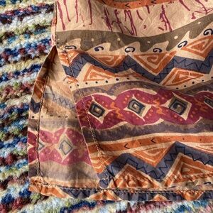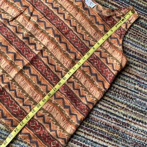 100% silk tank. In perfect condition. Brown, orange, red, green, and gray tribal print. Slits at hip. Wide straps. Scoop neck. Cool and perfect for summer. No flaws