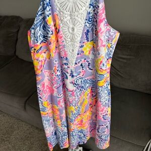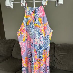 This Lilly Pulitzer dress showcases a stunning blend of pink, purple, and yellow in a vibrant pattern. Its bold and eye-catching style is sure to be a showstopper! EUC