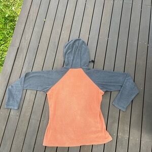 Melanzana sweater, Features a cozy hood. Contrasting gray and orange design. There is a hole that has been sewed on the right sleeve and a small hole on the back that has also been sewed. Both are pictured