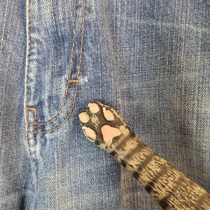 Super rad VINTAGE pre-owned item with LOTS of life left! Great classic Y2K retro 90s style! Has good natural distressing and is whiskered and faded in front for that awesome retro vibe! No rips or tears noted aside form the thread pull/scuff near zipper bottom on front. The original button on the fly was also replaced with a retro plastic black button, looks to be a suit jacket button- it is very secure. There is a small round brownish stain on front right knee area. Front right pocket has unraveled stitching creating about a 1" hole in the pocket (see pics- kitty paw pointer highlights flaws) As “condition” status is rather subjective please view all photos for exact condition details & review all measurements to ensure a good fit for you.