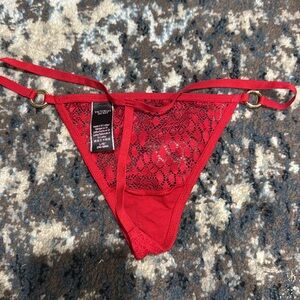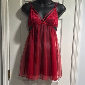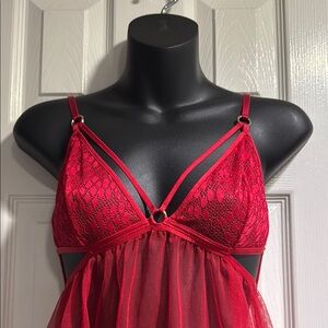 Experience the allure of this red chemise from Victoria's Secret, featuring delicate lace trim and a deep V-neckline. The empire waist design flows into a sheer, flirty skirt, creating a captivating silhouette perfect for intimate moments.