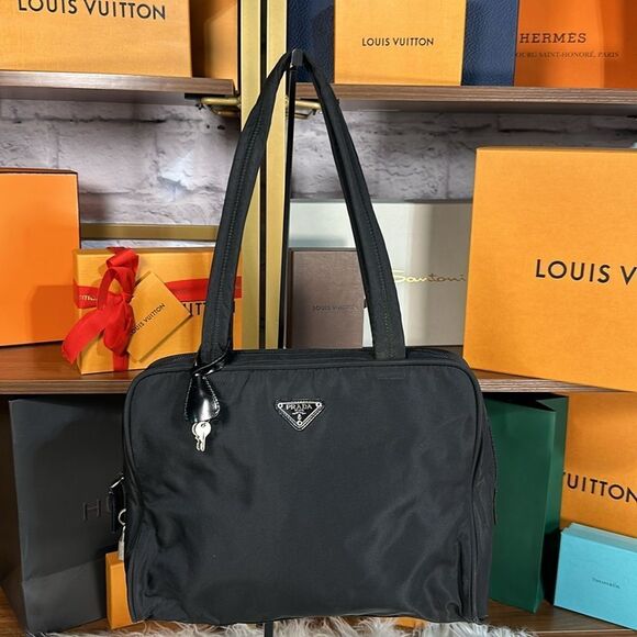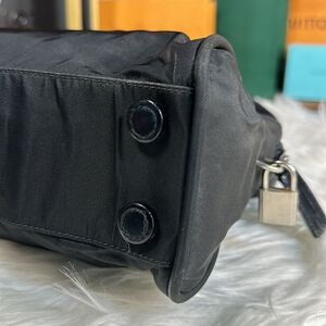 Black Prada briefcase. Size is perfect for a small daily carry bag. Few signs of usage but overall in good shape with tons of life left. Comes with lock and key! 100% Authentic!