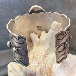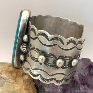Navajo Kingsman Turquoise Stamped Sterling Silver Large Cuff Bracelet Butte J815