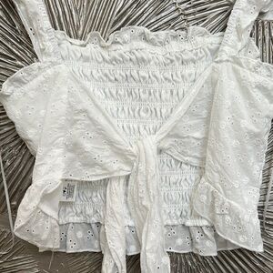 This sleeveless tank top features a smocked bodice and delicate ruffled straps, offering a romantic and airy feel. The cream color and lightweight fabric make it perfect for warm weather, while the stretchy smocking ensures a comfortable fit.