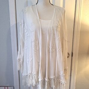Stylish cream colored mesh and lace kimono with stunning embroidery and tassels around the hem and sleeves. Ideal for casual wear or can be dressed up. I bought the cream colored Bobeau top to go with this and they match perfectly, but I've worn it once (see last picture). The pair could be bundled for a really great price. Excellent used condition from smoke-free, pet-free home.
