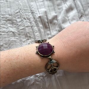 Stylish bracelet with a purple stone and silver peace symbols. Adds charm to any outfit.