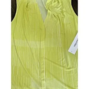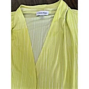 Calvin Klein Women's Pleated Geometric striped V-Neck Top Lime & White M